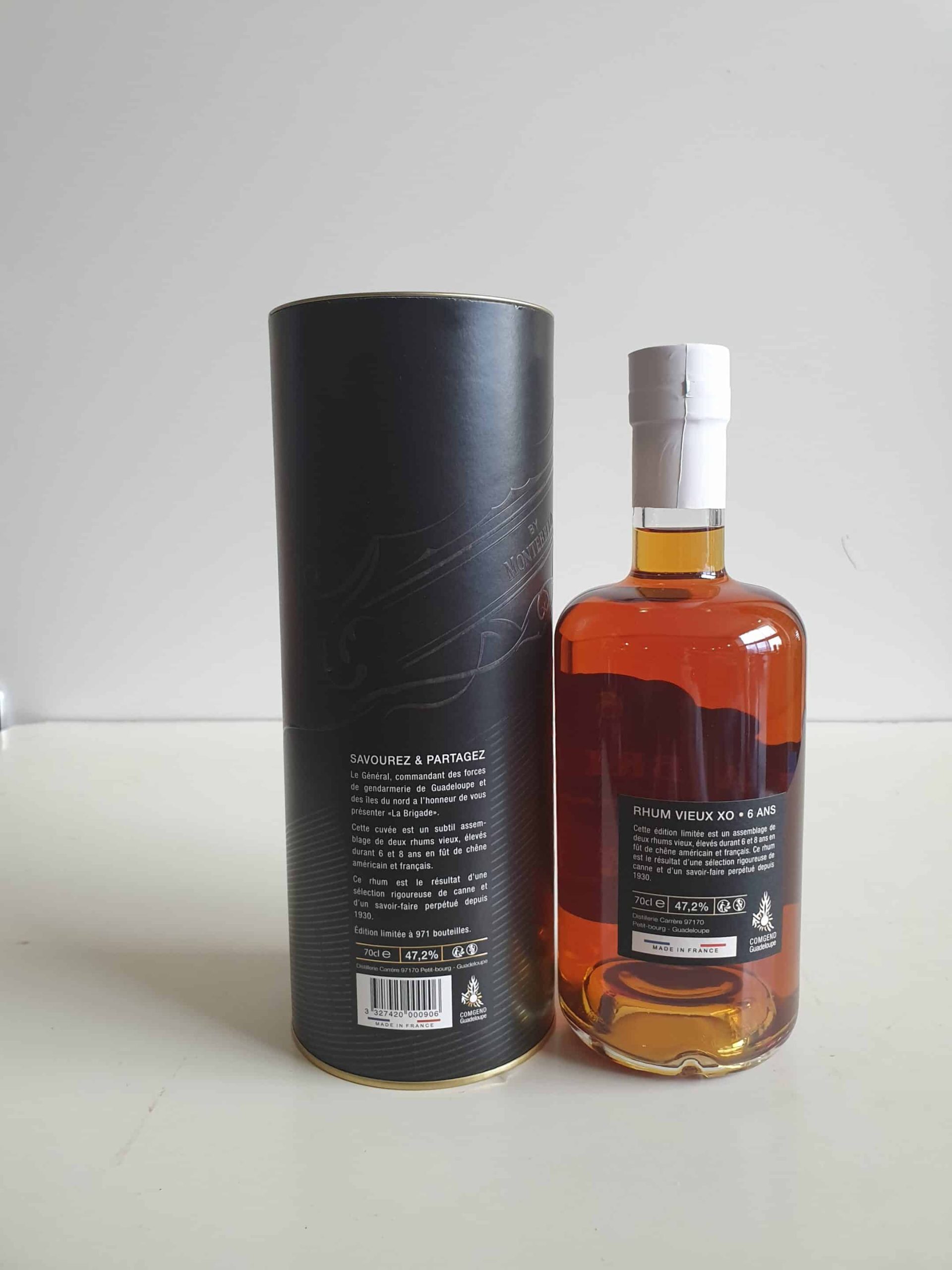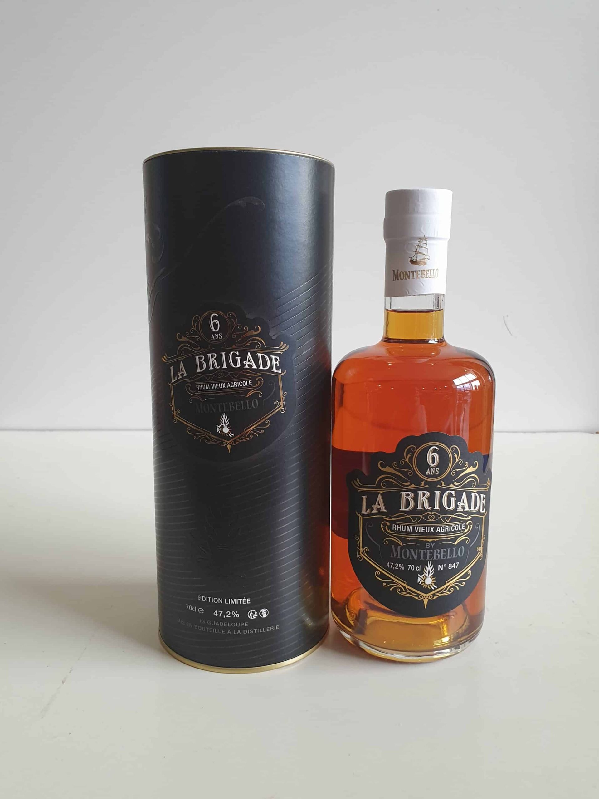 Le rhum vieux MONTEBELLO 70 cl 47.2° » LA BRIGADE » issu d’une sélection de canne rigoureuse et élevée durant 6 et 8 ans en fûts de chêne français et américain pour être assemblés en fin de vieillissement et produire cette subtil cuvée en l’honneur des forces de gendarmerie de GUADELOUPE et des ILES du NORD . Une édition numérotée et limitée à 971 bouteilles . Un rhum vieux sublime de la réputée distillerie familiale MONTEBELLO en GUADELOUPE .