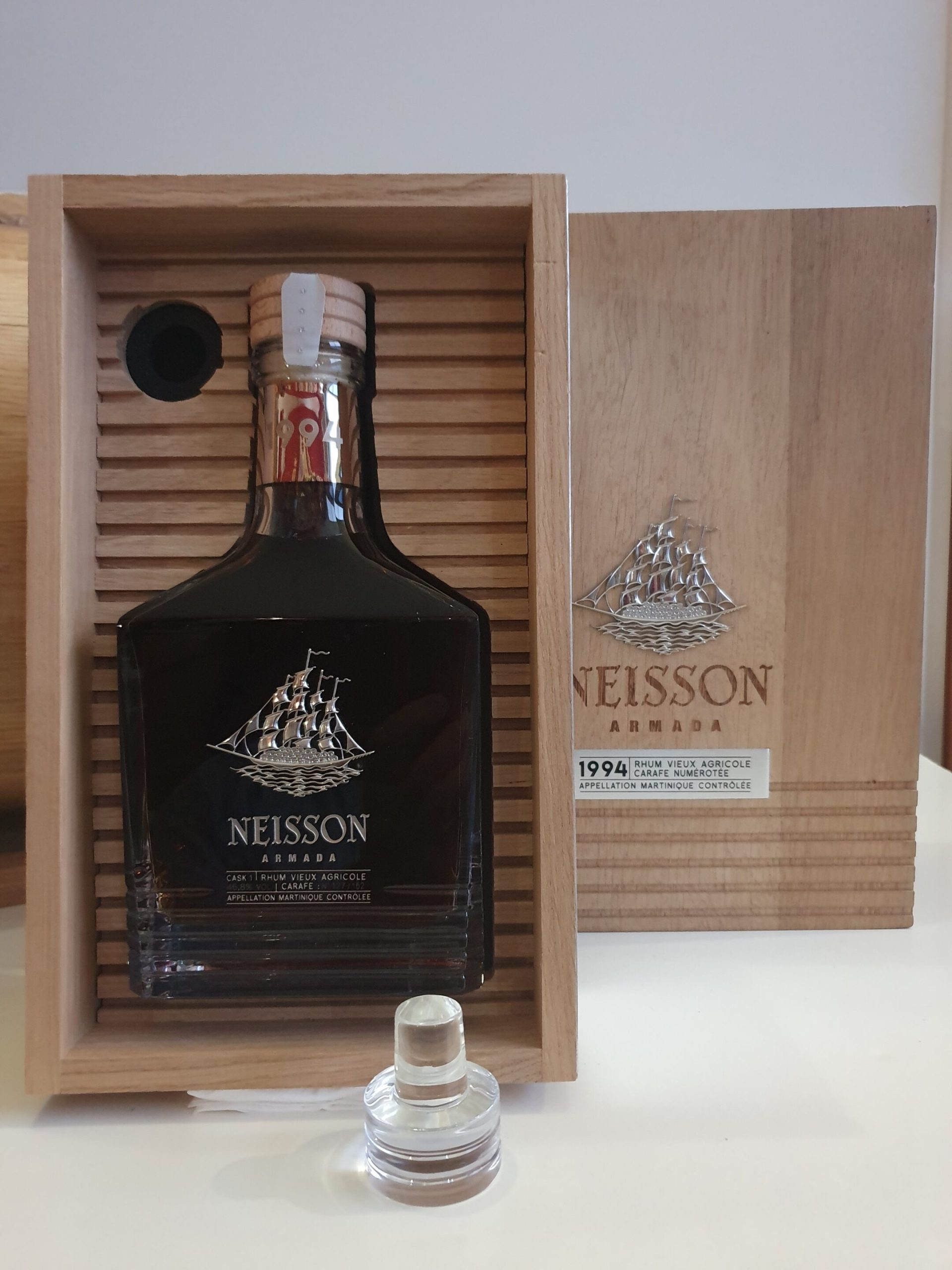La carafe de rhum vieux NEISSON 70 CL 46.8° COLLECTION ARMADA millésime 1994 à vieilli pendant 23 longues années en fût de chêne dans les chais de la distillerie . Une édition limitée et numérotée à 162 flacons d’exception . Embouteillée dans une sublime carafe en cristal qui prend place dans un magnifique coffret en bois . Un rhum vieux d’exception rare de la réputée distillerie familiale NEISSON en MARTINIQUE .