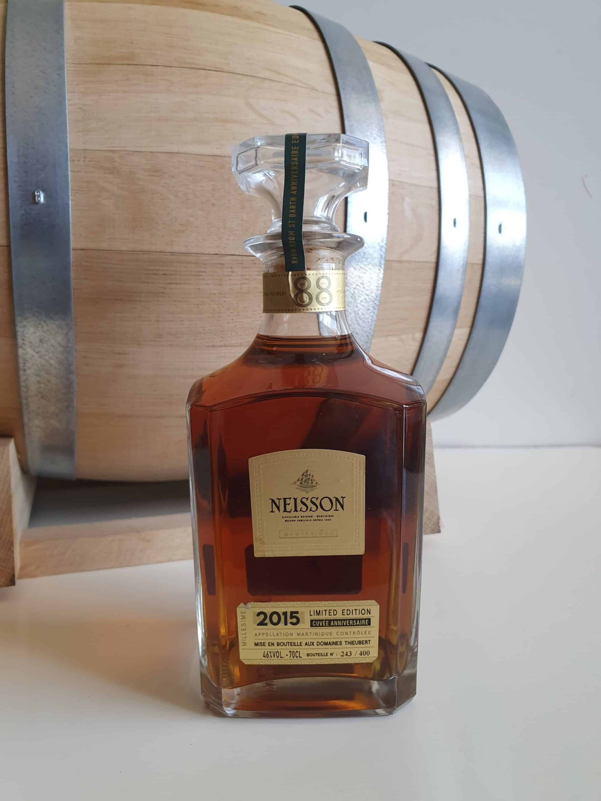 Le rhum vieux NEISSON 70 cl 46° cuvée anniversaire 88 ans millésime 2015 sorti à l’occasion du RHUMROOM ST BARTH EDITION en édition limitée et numérotée , une somptueuse carafe pour cette cuvée de 400 exemplaires . Un rhum vieux d’exception de la réputée distillerie familiale NEISSON en MARTINIQUE .