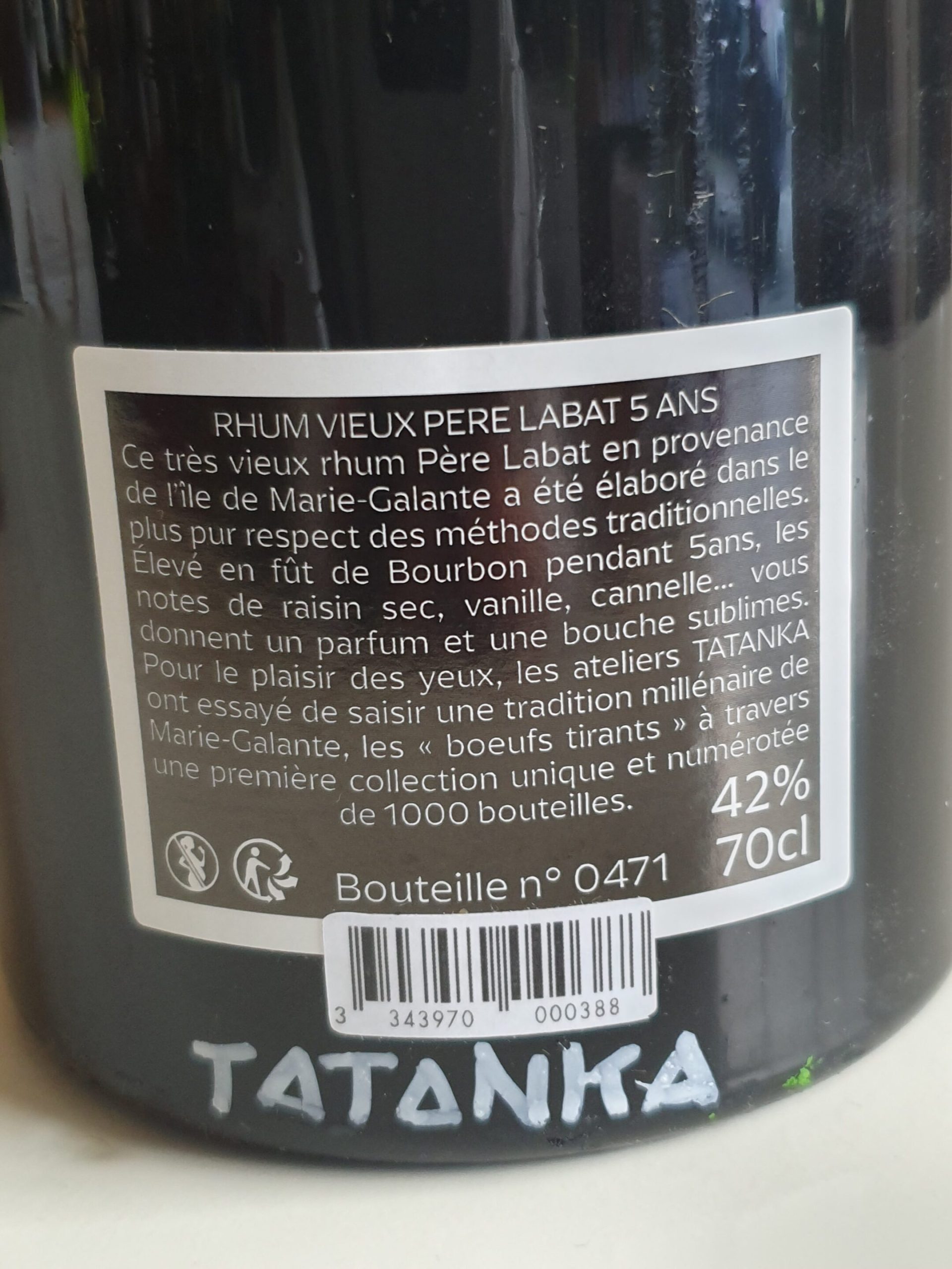Le rhum vieux PERE LABAT 5 ans 70 cl 42° » TATANKA BOEUFS TIRANTS » à vieilli 5 longues années en fûts de chêne ayant contenu du bourbon dans les chais de la distillerie . La bouteille est peinte par l’atelier TATANKA représentant une tradition de plusieurs centaines d’années , les » boeufs tirants » . Une édition limitée et numérotée à 1000 flacons . Un rhum vieux d’exception de la réputée distillerie POISSON / PERE LABAT sur l’ile de MARIE-GALANTE . Numéro de la bouteille non contractuel .